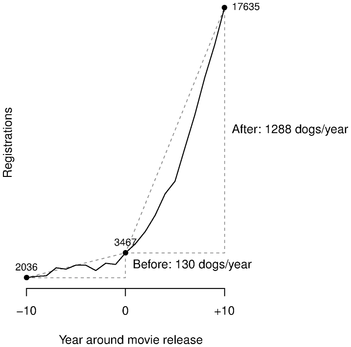 Ghirlanda, S., Acerbi, A., Herzog, H. (2014), Dog Movies Stars and Dog Breed Popularity: A Case Study in Media Influence on Choice, PLOS ONE, 9(9), e106565