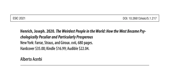 Review of Joseph Henrich, The Weirdest People in the WorldJun 15, 2021·Alberto Acerbi· 0 min read PDF Cite DOITypeReview-BookPublicationAcerbi A. (2021), Review of Joseph Henrich, The Weirdest People in the World, Evolutionary Studies in Imaginative Culture, 5 (1), 91-96Last updated on Jun 15, 2021Cultural Evolution AuthorsAlberto AcerbiAssociate Professor ← Culture without copying or selection Nov 26, 2021Beyond social learning May 18, 2021 →