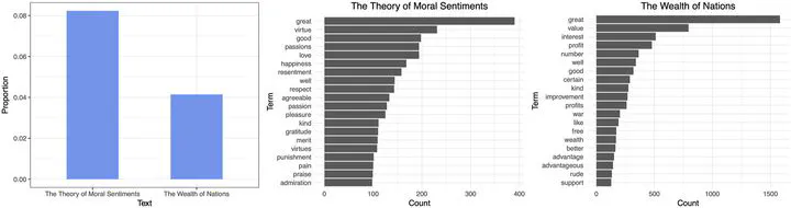 In this paper, we perform a text analysis of Adam Smith’s two books, the Theory of Moral Sentiments and the Wealth of Nations, to better characterize their highly disputed differences in terms of moral cognition. In particular, given that Smith’s ideas are still very cited and influential in the current scholarly debate on moral cognition, we are interested in understanding whether a text analysis would unveil a semantic structure that is in line with a dual process theory interpretation or, alternatively, with a neuro-emergent cognition one. We find that, despite that the intellectual koine in which Smith’s thought was originally embedded would be more in line with a dual process theory approach, the analysis reveals a better consonance with the neuro-emergent cognition approach. This opens new and interesting perspectives in future research on the moral cognition of market interactions in a Smithian tradition of thought.